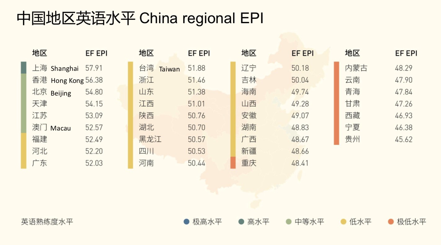 结果显示,不论在国家发展还是个人层面上,英语都表现出了较强的相关性。中国今年整体得分略有下降,在88个国家中排名47位,位于低熟练度范围。