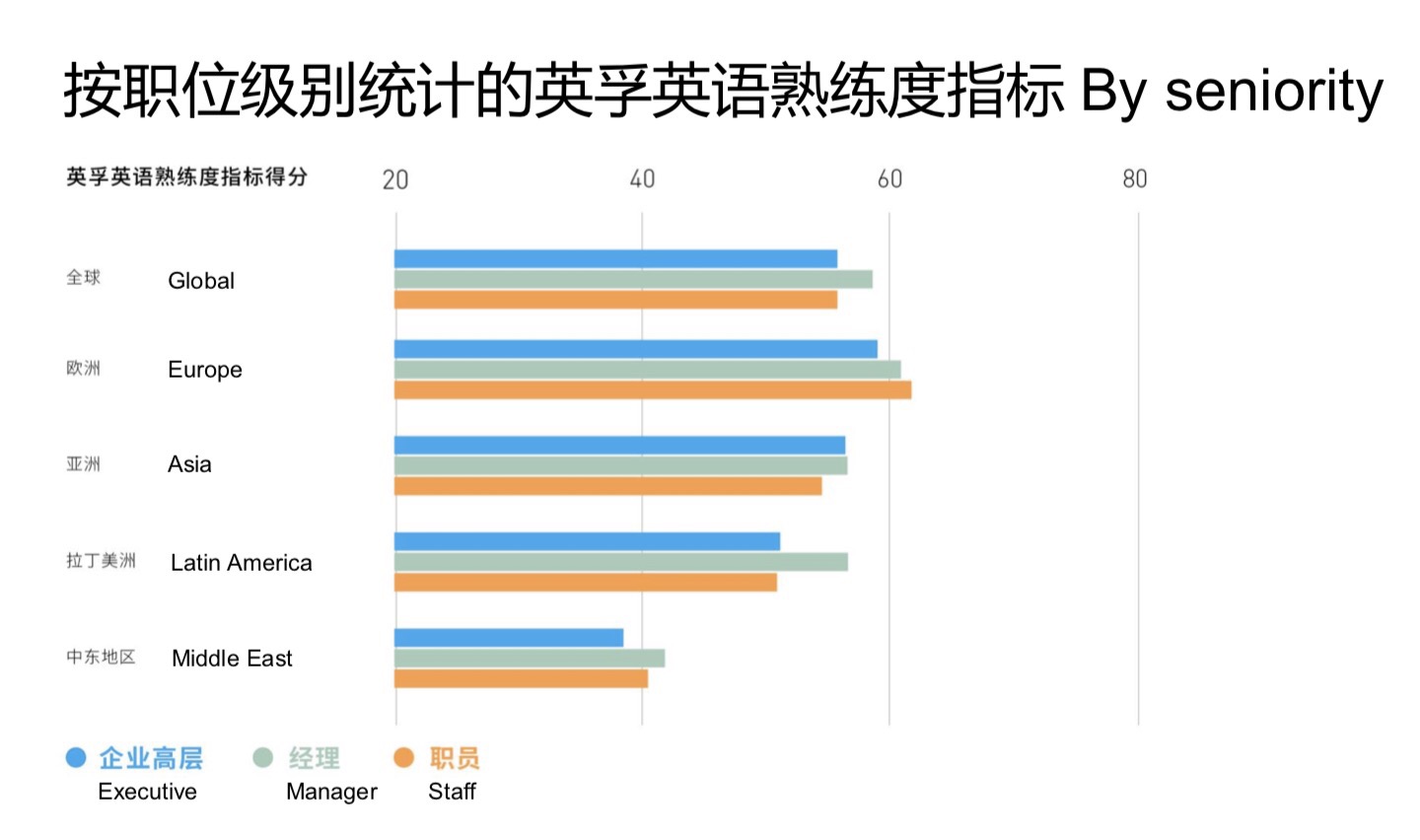 尽管报告指出了英语水平与人均国民收入的正相关性,但落实到个人头上时,职级上的差别并未与英语能力紧密挂钩。与高管和一般员工相比较,经理级员工的英语熟练度最高,尤其是在平均年龄较年轻的地区;从地区来看,拉丁美洲的这一趋势表现最为明显。究其原因,比起基层员工, 经理级员工有更多机会练习英语口语。同时,高管通常年纪较大,来自不太重视英语的业务部门。
