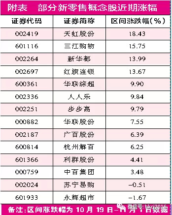这种积极预期也直接反映到了二级市场,例如阿里系的三江购物、新华都等自10月19日“双11”启动以来,截至11月1日,累计涨幅分别高达15.7%和13.9%,腾讯系的步步高累计上涨9.79%,此外老牌零售企业天虹股份累计上涨18.42%,华联超综、百联股份等涨幅也在9%以上。而同期上证综指涨幅仅为4%。(见附表)