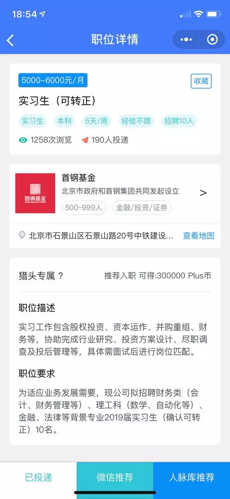 猎头找到合适岗位后,可在招聘页面中点击底部的“微信推荐”。