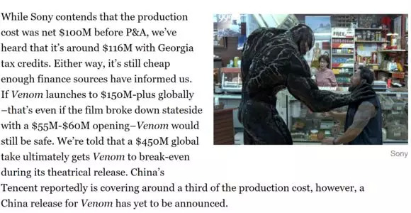 为了这部电影在中国的表现,索尼也找来了重要的合作伙伴。此前Deadline等媒体报道,《毒液》制作成本约1亿美元,腾讯出资获得了该片约1/3的全球权益,并负责影片在国内的发行工作。