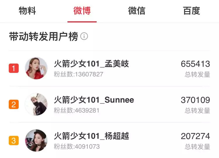 百度指数显示,10月25日推广曲发布后《毒液》的百度指数迎来一个小高峰。而电影的微博带动转发用户榜前三位也均为“火箭少女”成员。