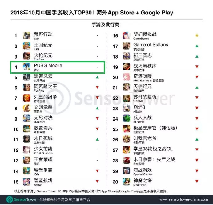 10月出海手游收入TOP30:《PUBG Mobile》维持第4