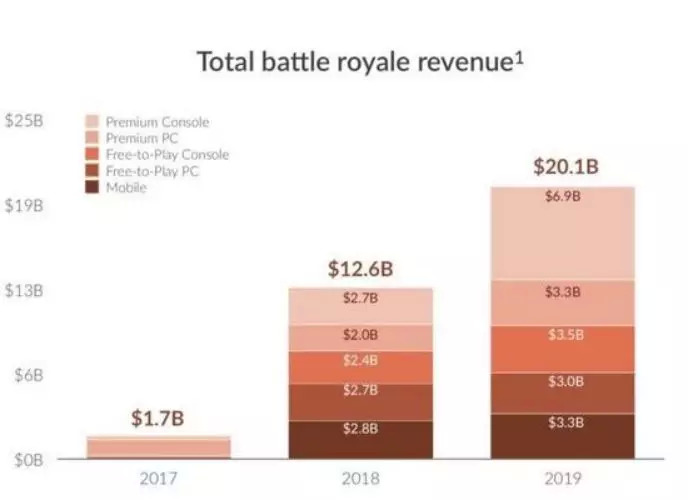 根据Superdata发布的全球“吃鸡”游戏的预计收入报告显示,这类游戏在接下来的两年或将成为主流。2017年,“吃鸡”游戏拿下了17亿美元的营收,而到了2018年,“吃鸡”游戏总收入或将达到百亿级别(126亿美元),占比全球总游戏收入12%。在这之后,增长趋势放缓,2019年预计达到201亿美元。