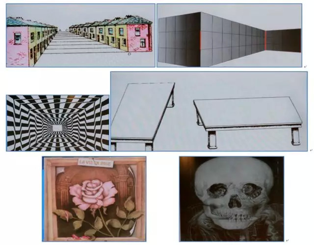 图一,AB和CD哪一个长?看起来是AB较长,这就是视觉的错觉效应。图二,米勒·莱尔的幻觉效应,哪条红线更长?实际上两条线是一样长的,这就是对比的差异。图三,所有的正方形是完全的正方形吗?我怎么看都不像完全正方形,但实际上是的。图四,两张桌子的面积一样大吗?实际肯定是一样大的,但是看起来却不一样大,直观来看就是右边的桌子比左边的大一点。图五,既可以看成是一朵花,也可以看成是两个相拥接吻的恋人。图六,可以看作是一个骷髅,也可以看作是一个男士在向一个女士求婚。