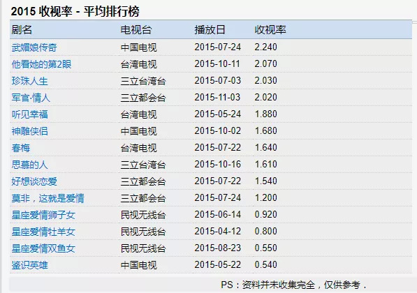 由于台湾收视率资料获取困难,网络流传多有时效之后,一份截至2015年的榜单虽不全面,但也能从中发现端倪: