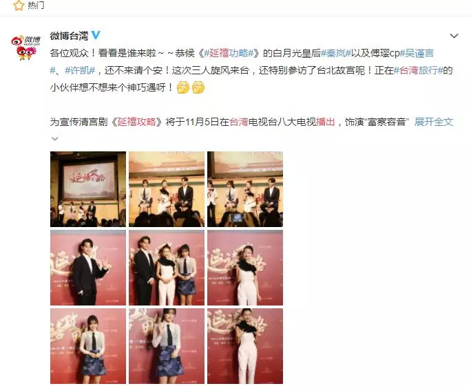 《延禧攻略》在爱奇艺台湾同步播出后,时隔数月宣布将在八大电视播出,热度也从暑期延续到冬季。从网播转战八点档,《延禧攻略》虽然改成了莫名其妙的《熹妃:延禧攻略》,被网友吐槽“熹妃是嬛嬛,魏璎珞是令妃”,但也不阻碍台湾粉丝们的热情。10月底,《延禧攻略》在台湾宣传,众主创就受到了与内地同样的热烈欢迎。