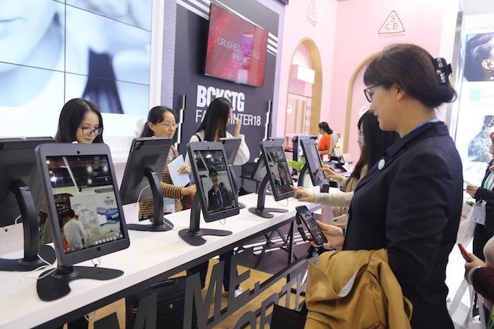 AR美妆工具ModiFace在现场吸引了不少观众使用,用户只需轻触屏幕进行选择就能体验腮红、眼影、眼线笔、口红等产品。而在美发领域,与Modiface合作在2018年推出的专业3D染发APP“Style My Hair”也有展出,这款APP主要为沙龙的专业造型师提供帮助,可实时为消费者提供虚拟尝试新发色的服务。