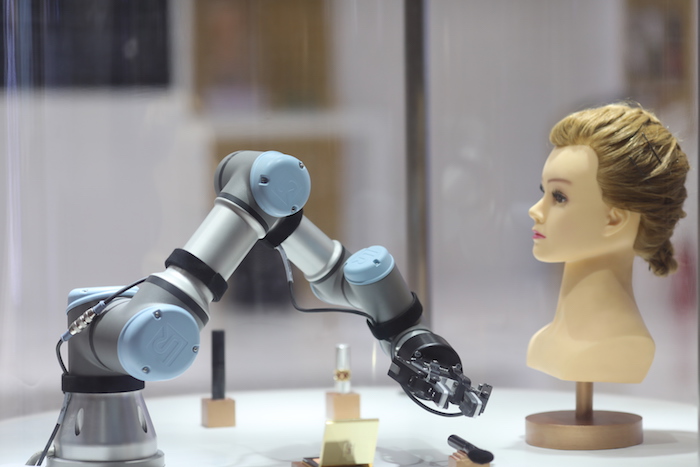 代表工业智能制造技术的机器人设备也正在与美妆行业结合。欧莱雅的一台自动美妆机械臂吸引了不少人驻足。据工作人员介绍,这台5分钟可以完成一个妆容的机械臂并非直接投入市场的化妆机器人,类似的多关节机器人目前在工厂生产线广泛运用。