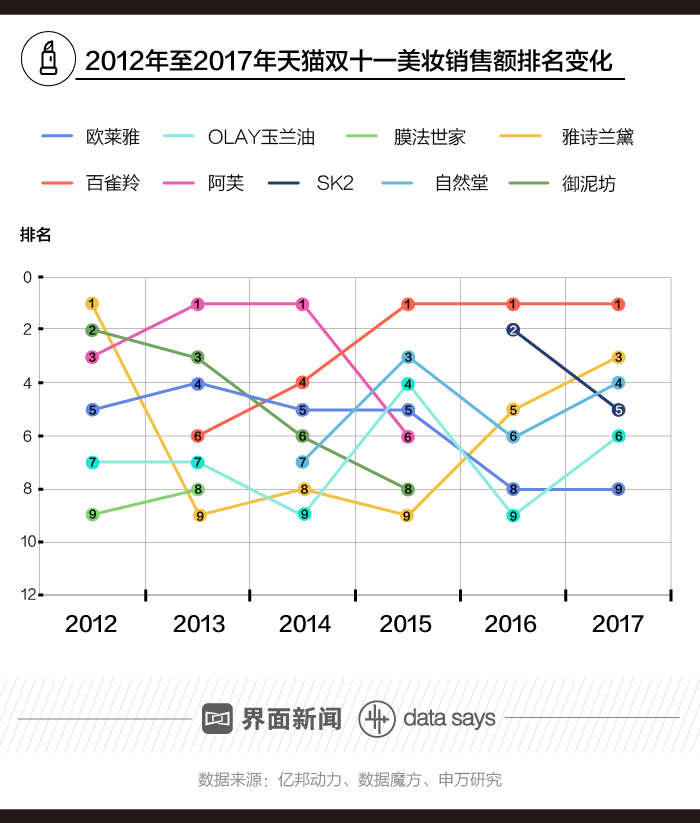 还有些品牌的排名虽略有波动,但总能进入十强。欧莱雅六年来都在美妆第五名至第九名间徘徊,太平鸟过去七年中在男装第二名和第六名间来回,Only则连续七年进入前十,2016年还成为女装第二。