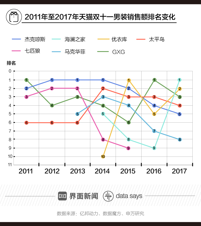 而相较于竞争异常激烈的女装市场,双11的男装销售排名波动不大,如今能让男装从众多品牌中突出重围的就是品牌力基础。
