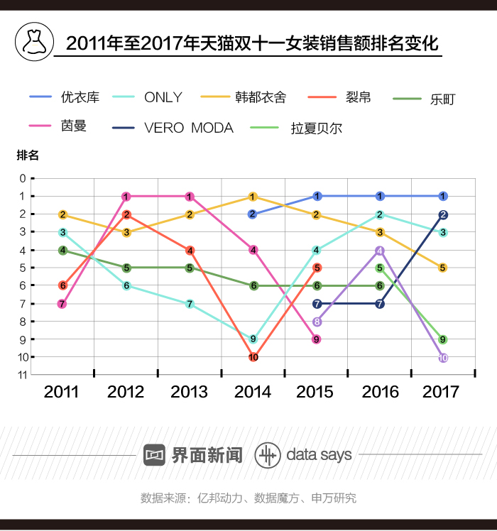 优衣库的强势入局率先改变了双11女装的格局。虽然最近几年韩都衣舍的排名仍未跌出前五,但裂帛、茵曼等淘品牌却已经从最近两年的榜单中消失了。