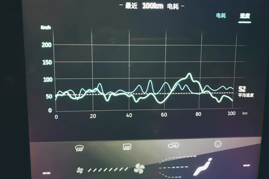 全程高速下的续航里程我们下一篇会做。但是鉴于其实我在行驶的时候有不低于1/4的路况是在绕城高速上,所以这台新车目前的平均时速有52km/h之高,我对EX5在全高速路况下的表现还是比较有信心的。