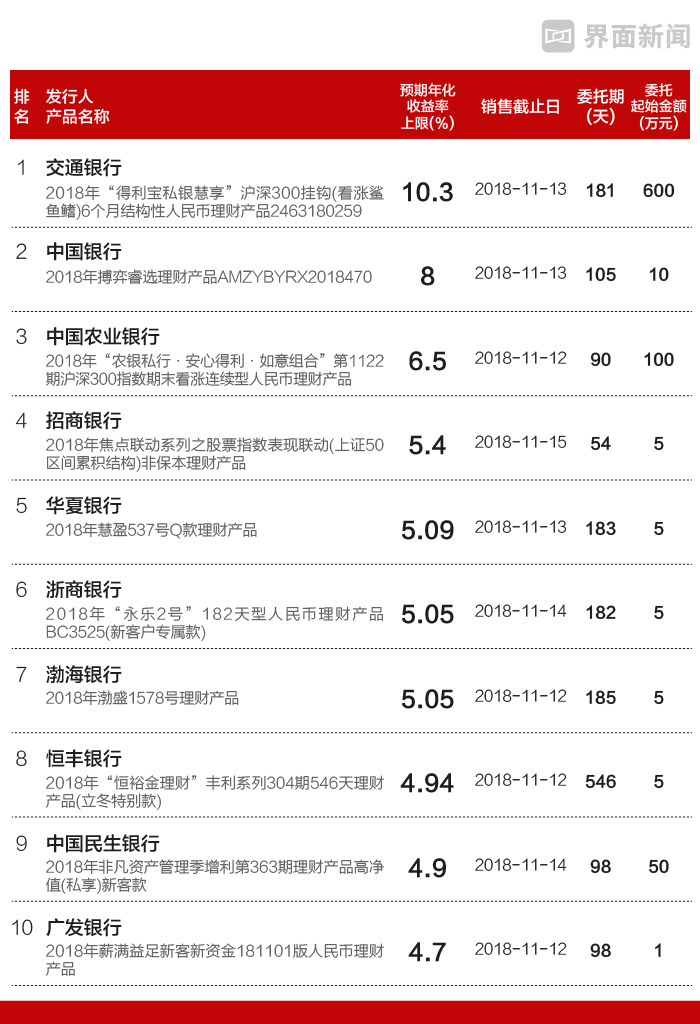 来看看本周有哪些可以挑选的银行理财产品。本周,18家国有商业银行和股份制商业银行全国范围在售针对个人的人民币理财产品215只,其中未包含结构性存款银行理财。界面新闻从每家筛选了收益率最高、最值得关注的理财产品,共10只。