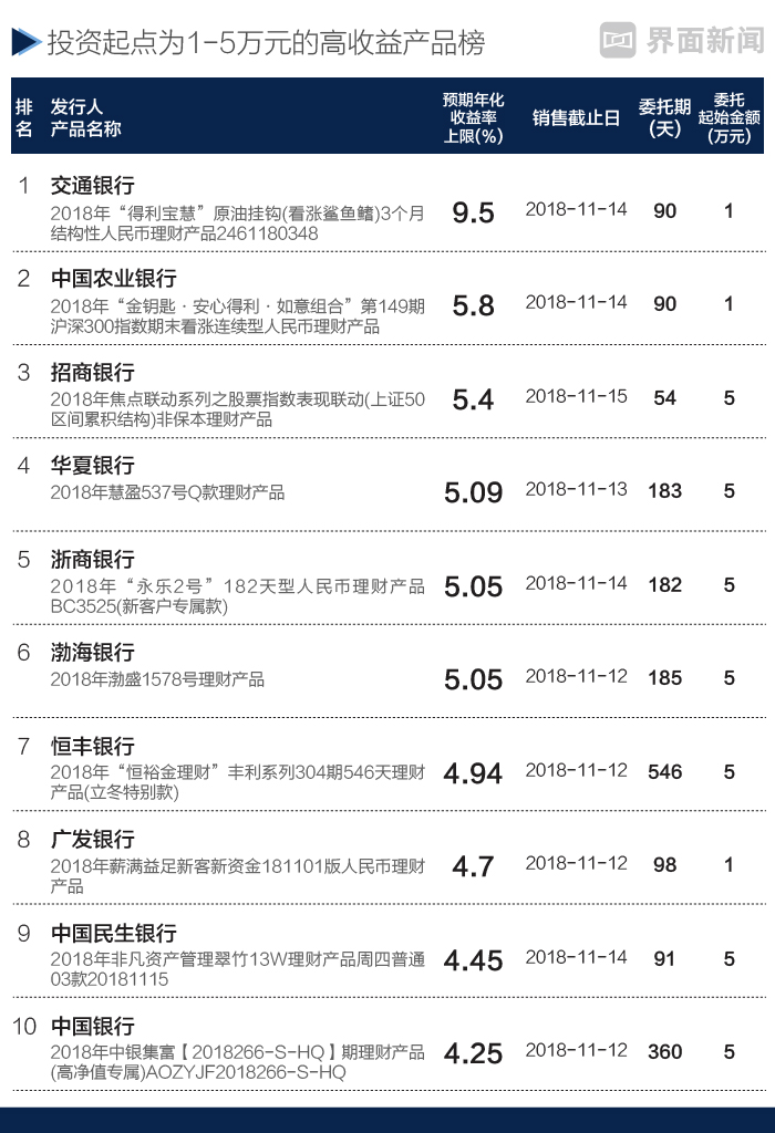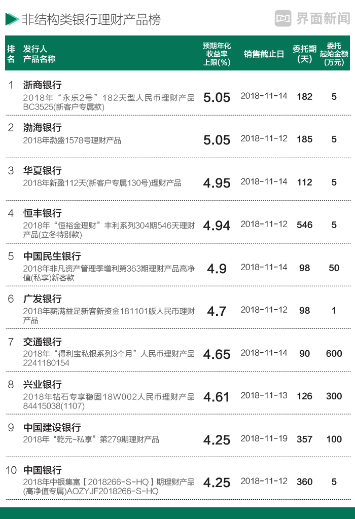 考虑到投资者的拟投资金额、风险偏好不同,本期还对起点为1至5万元的银行理财产品以及抛去结构化产品收益复杂设置、收益相对稳定的非结构类理财产品进行筛选,做成榜单,供投资者参考。