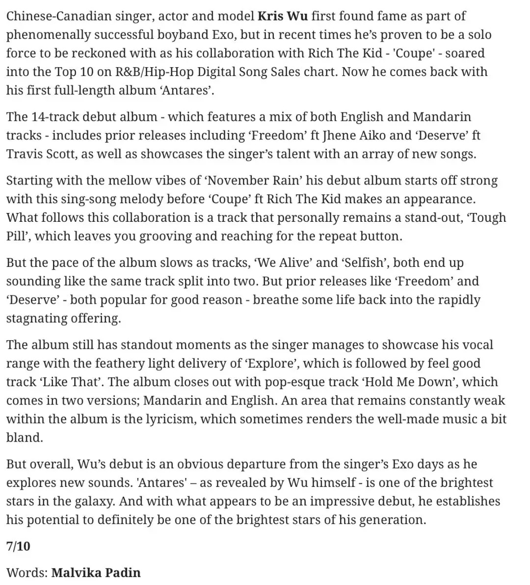 而《Clash Magazine》给《Antares》打了7/10分:“《November Rain》氛围柔和、旋律感强烈。紧接着和Rich The Kid合作的《Coupe》之后是一首颇为强烈的《Tough Pill》,会让你想跟随音乐扭动身体且不停循环播放。《We Alive》和《Selfish》听上去很像同一支作品被分成了两首,拉慢了整张专辑的步调。不过像《Freedom》和《Deserve》这样一些已经很受欢迎的发行作品还是给它添注了一些活力。”文章称赞这是吴亦凡离开EXO之后对新声音的探索,但同时也指出歌词及相关情感表达的不足,让音乐制作变得平淡无奇。