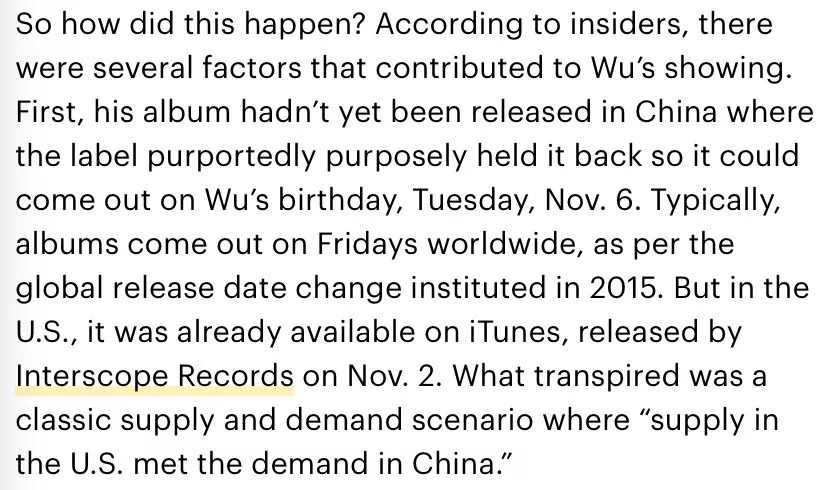 针对《Antares》在过去两天内曾突然掉榜的现象,Variety还给出了自己的答案:当《Antares》于11月2日上线美国iTunes时,中国国内并未发行,可能是因为团队希望能在吴亦凡11月6日生日当天发歌的策略安排。那么这就构成了一个典型的供需情景:美国的供给满足了中国的需求。理所当然,当中国市场已经有了这种供给之后,受众就不再对海外平台有这样的需求。