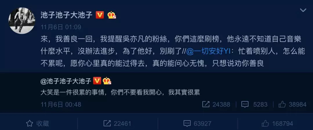 说起这次Kris Who风波,不得不提起一个人:出生于1995年的内地脱口秀演员池子。11月6日,池子就该事件发文称:“来,我善良一回,我提醒吴亦凡的粉丝,你们这么刷榜,他永远不知道自己音乐什么水平,没办法进步,为了他好,别刷了。”此后,因为微博被吴亦凡粉丝要求道歉的言论攻陷,又“发表声明”称“我哪里做错了你们要我道歉。”