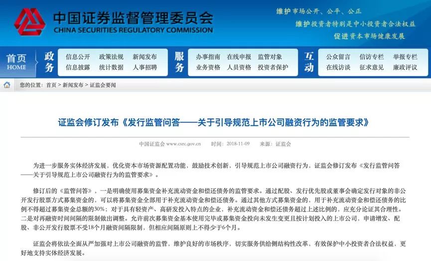 11月9日,证监会修订发布《发行监管问答——关于引导规范上市公司融资行为的监管要求》(以下简称《监管问答》),修改了两项关键规则:
