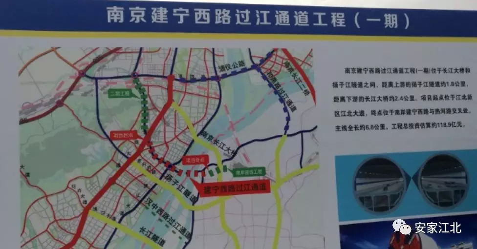 1、建宁西路过江通道,总投资估算约118.9亿!位于南京长江大桥和扬子江隧道之间,起自江北新区兴浦路与江北快速大道交叉处,沿兴浦路东侧向南跨越津浦铁路后,以隧道方案穿越长江。路线全长约6.8公里。