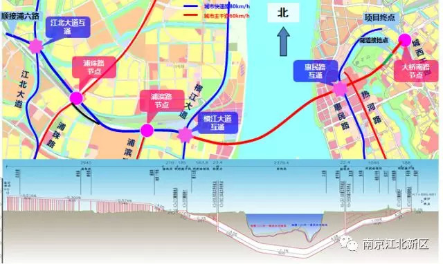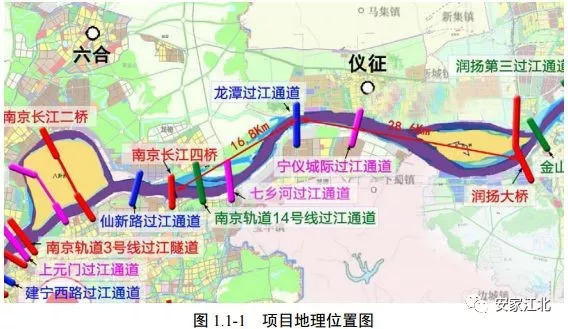 项目位于南京长江大桥和扬子江隧道之间,起自江北新区兴浦路与江北快速大道交叉处,沿兴浦路东侧向南跨越津浦铁路后,以隧道方案穿越长江。路线全长约6.8公里。