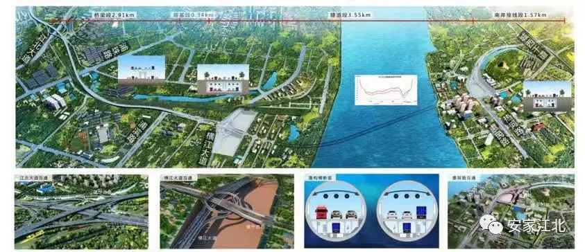 两岸接线江北以桥梁为主,江南以明挖隧道为主,在江北大道、横江大道和惠民路处各设置一座互通式立交,其中横江大道互通和惠民路互通位于明挖隧道段,均为地下互通。