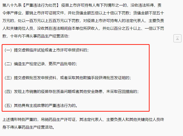 《中华人民共和国疫苗管理法(征求意见稿)》第八十九条规定,疫苗上市许可持有人有下列情形之一的,没收违法所得,责令停产停业,撤销上市许可证明文件,并处货值金额五倍以上十倍以下罚款;货值金额不足五十万元的,处以一百万元以上五百万元以下罚款,对疫苗上市许可持有人的法定代表人、主要负责人和关键岗位人员,没收其在违法期间自本单位所获收入,并处以百分之五十以上、一倍以下罚款,十年内不得从事药品生产经营活动。(一)提交虚假临床试验或者上市许可申报资料的;(二)编造生产检定记录、更改产品批号的;(三)提交虚假批签发申报资料,或者采取其他欺骗手段获得批签发证明的;(四)发现上市销售的疫苗存在质量问题或者其他安全隐患,未采取召回措施的;(五)其他具有主观故意的严重违法行为的。上述情形特别严重的,吊销药品生产许可证,其法定代表人、主要负责人和其他关键岗位人员终身不得从事药品生产经营活动。