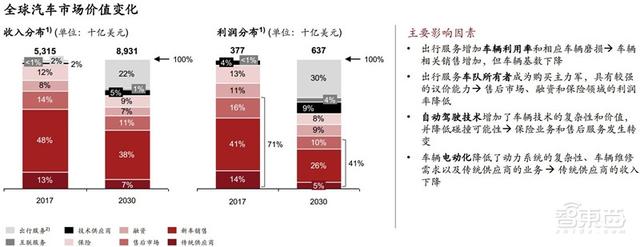 以上一系列趋势的影响下,到2030年,传统供应商、 车辆销售和售后市场的利润份额可能大幅降至41%。而出行服务的利润份额将从12%大幅增长到30%,超过新车销售利润。