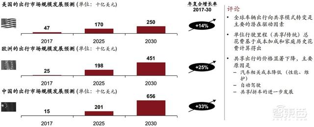 所以自2017年起,美国、欧洲和中国的出行服务市场规模预计每年增长25%,到2030年达1.4万亿美元。