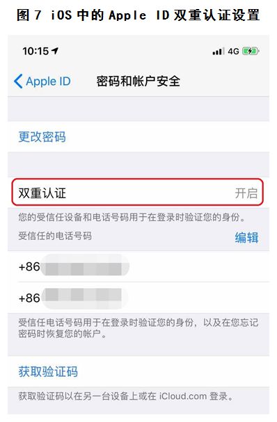(3)开启iOS的双重认证功能,路径如下:“设置”-“”-“密码与安全性”-“双重认证”开启:
