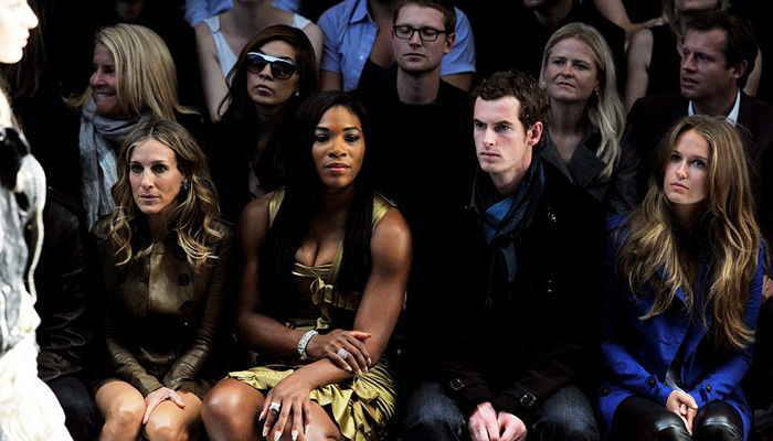 2010年9月,安迪·穆雷和西尔斯出席巴宝莉时尚秀。左一为著名演员萨拉·杰西卡·帕克,左二为网坛名将小威廉姆斯。