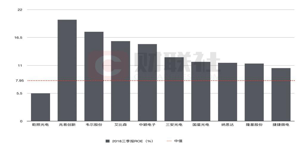 乾照光电的主营业务从产品细分领域看,主要生产红黄光LED外延片及芯片、蓝绿光LED外延片及芯片和砷化镓太阳电池外延片及芯片。其中,芯片产品在主营收中占比最大,2018年Q2在总营收中占比高达98.81%,毛利率水平为34.06%,相较上年同比下滑2.17%,而同行业公司三安光电芯片LED产品毛利率维稳且盈利水平逐渐提高,2016年Q4—2018年Q2毛利率水平分别为36.73%、45.34%、49.2%。在2018年Q3同行业的ROE水平对比中,乾照光电的盈利能力趋弱,不仅落后同行业公司且低于行业的平均ROE水平。