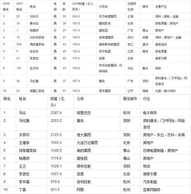 2008年福布斯中国富豪排行榜与2018年对比