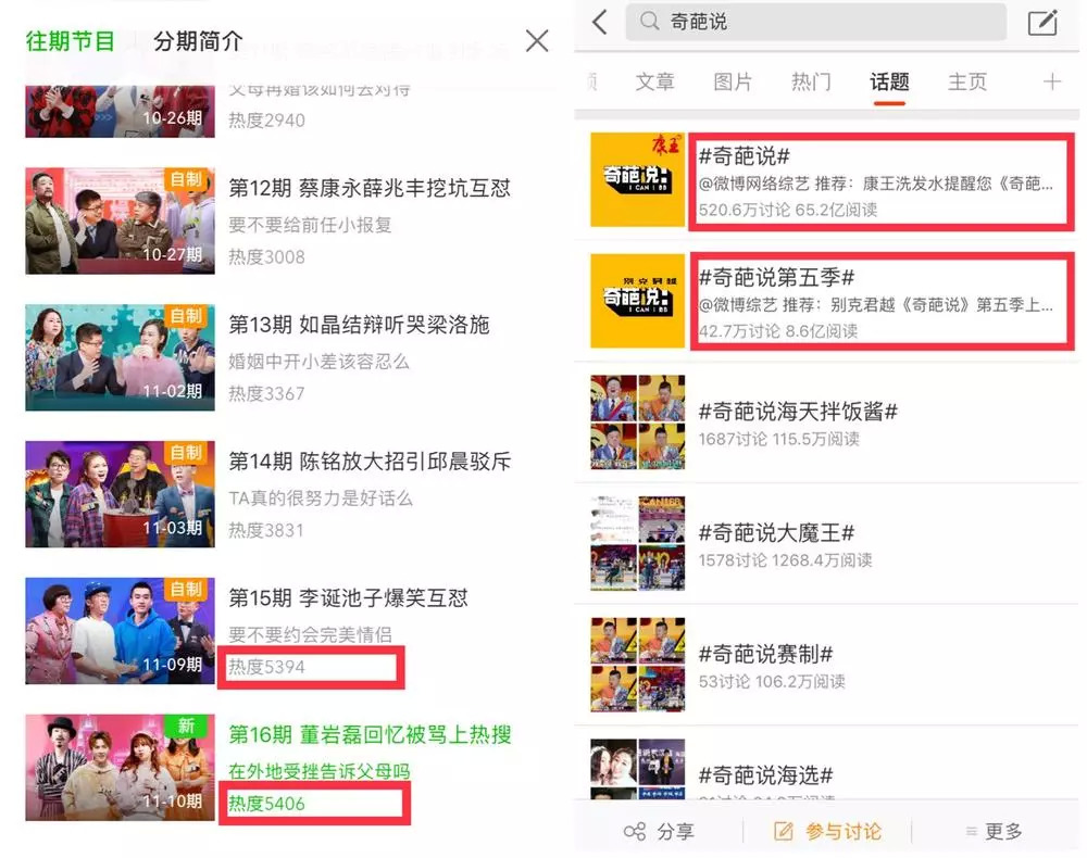 如此看来,《奇葩说》的商业价值得益于前几季的铺垫。节目首次上线时,两小时点击量破百万,第一季结束总播放量达2.6亿。第五季最新的两期节目中,实时热度近5500,相关话题总阅读量8.6亿,讨论量42.7万。一直以来,成绩与口碑俱佳的《奇葩说》,抛出的话题频频成为全民茶余饭后热议的焦点。未曾料想,被寄予厚望的第五季,阔别一年多后,竟是以“互撕”的方式再次引人关注。