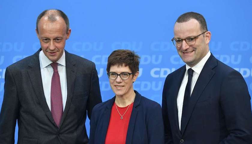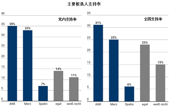 截至目前,基民盟仅公布了12名候选人中的6位,且仅有3人获得正式提名。而根据当前民调,真正有机会问鼎党主席一职的也正是这三位:前联盟党议会党团主席默茨(Friedrich Merz)、基民盟秘书长卡伦鲍尔(Annegret Kramp-Karrenbauer)和联邦卫生部长施潘(Jens Spahn)。