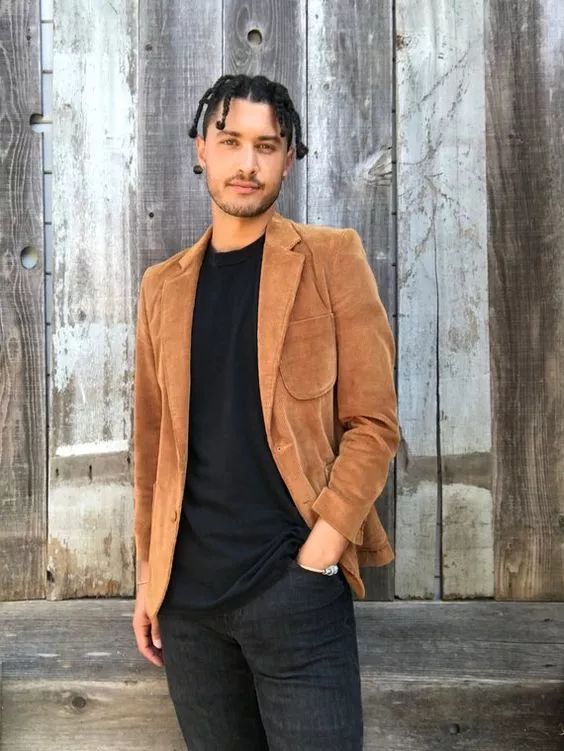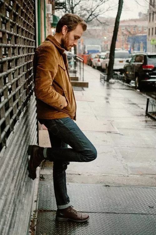 如果你想让自己看起来更Man的话,用牛仔裤和靴子搭配是非常不错的,因为灯芯绒本身柔和度好,所以加上这两种单品会让人感觉更“ 硬汉 ”一些,而灯芯绒跟牛仔面料也是非常合搭的。