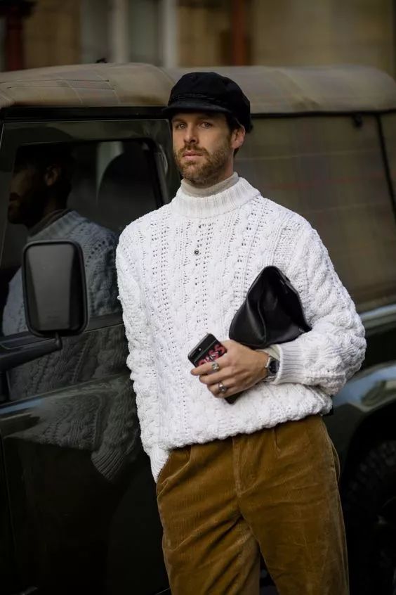 如果不想让造型太沉闷,可以选择用大地色的灯芯绒裤搭配白色的毛衣,毕竟白色在初冬也可以保暖