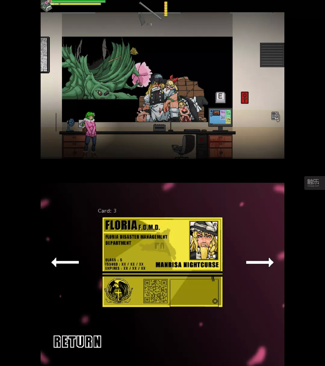 更有爱的是,作者显然也是个颇有情怀的ACG爱好者,借助“生化危机”的Flie系统塞了很多彩蛋在游戏中,并进行了再融合。比如,游戏中的小纸条们提到许多派遣特工的信息,在过关途中你将目睹其各异又归一的下场。这些特工显然都来自作者喜欢的一些作品,比如把名字从原作“Marisa”改成男性版“Manrisa”的过气车万角色。
