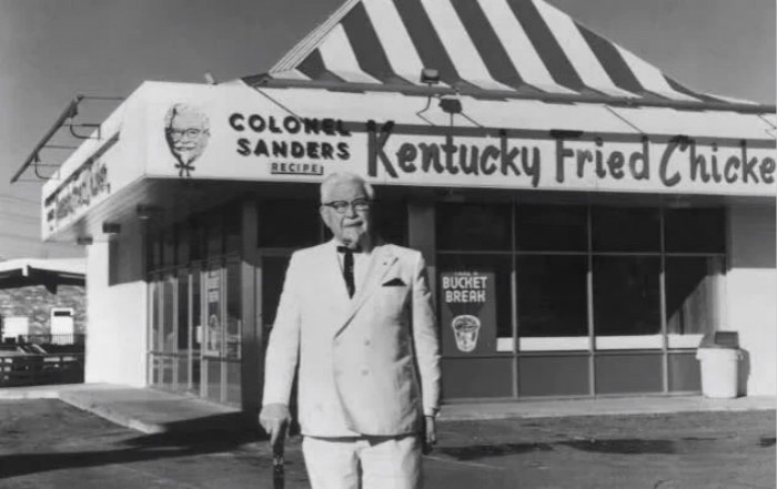 当时肯德基上校已经84岁高龄,但是他坚持以白色的棕榈装,戴上黑框眼镜的形象,出现在大众面前。
