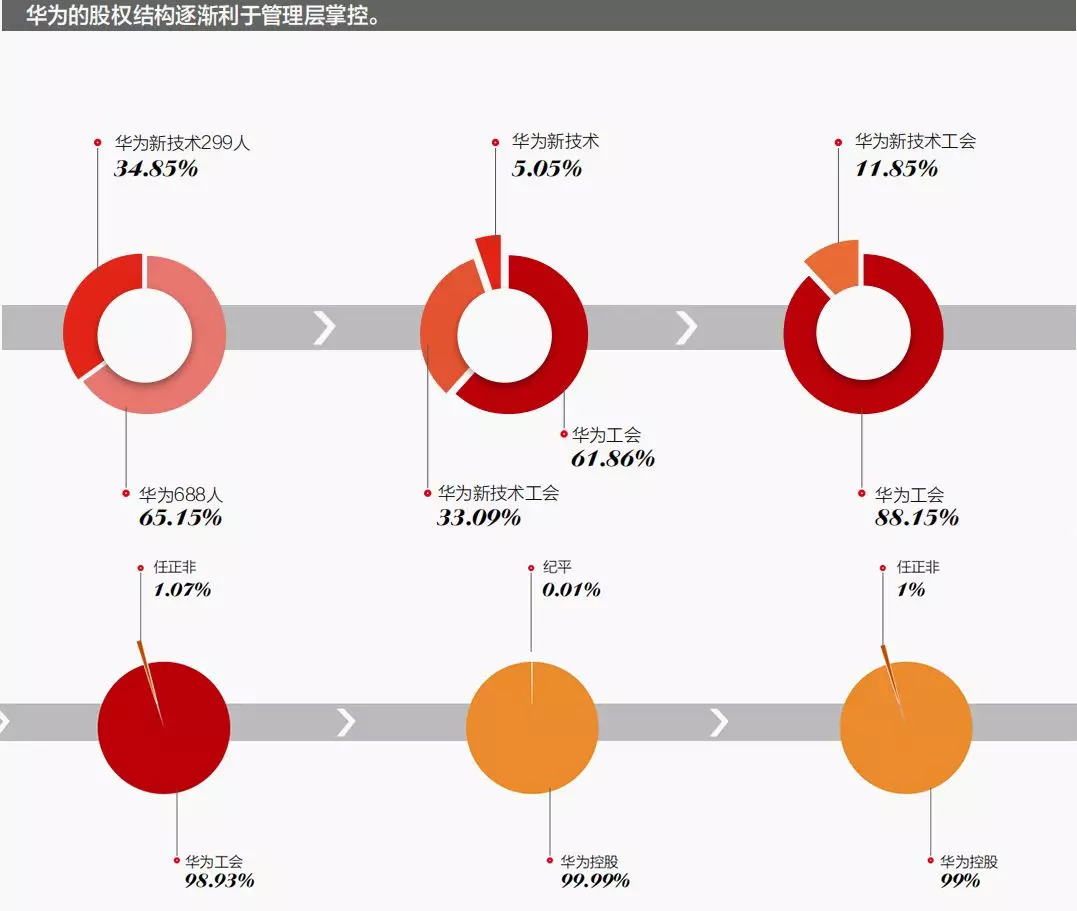 第一次改制后,华为工会、华为新技术工会以及华为新技术分别持股61.86%、33.09%、5.05%。同时决定,两家公司员工所持股份,分别由两家公司工会集中托管,并代行股东表决权。