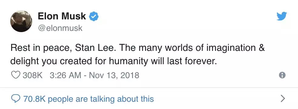 特斯拉联合创始人兼CEO 马斯克也对斯坦·李表示了敬意,马斯克曾提到过他对视觉艺术的兴趣。