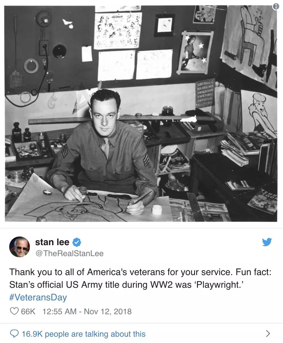 斯坦·李也是一名二战老兵,曾在信号部队服役。他在Twitter上的最后一条微博是为了纪念退伍军人节。