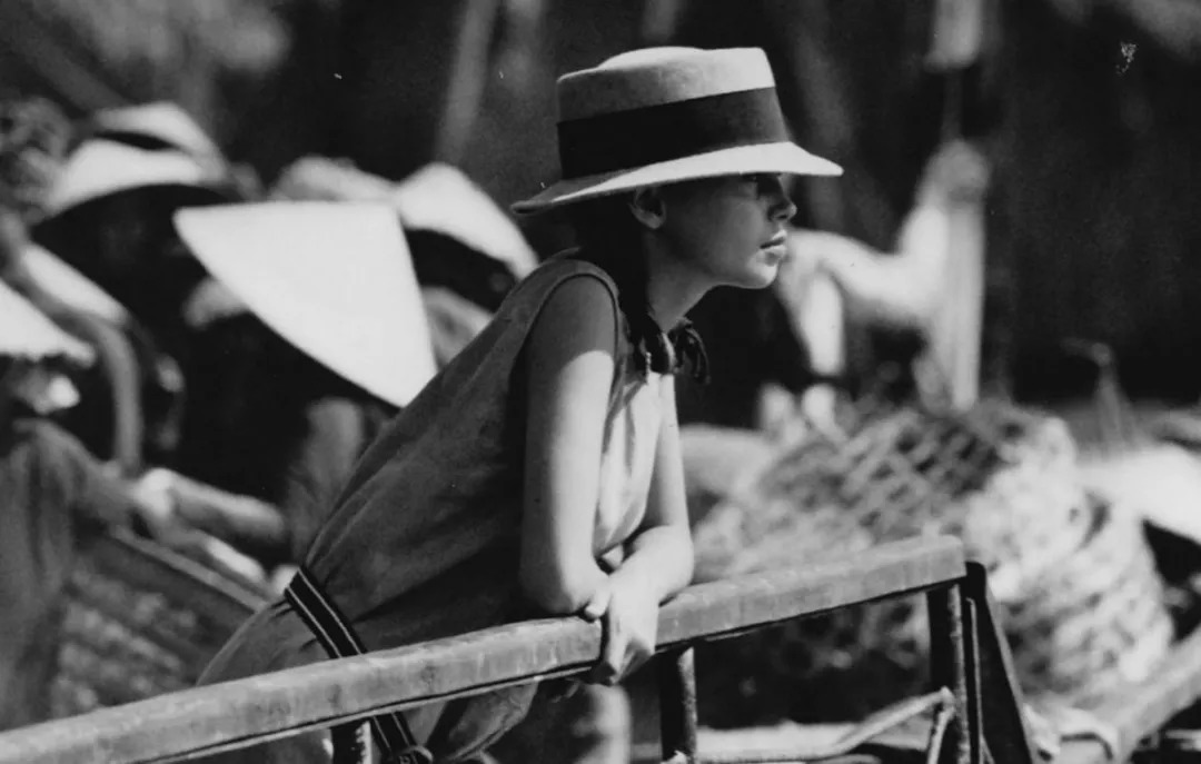 湄公河边,17岁的珍·玛奇戴着平沿呢帽,穿着裸色连衣裙,眺望着远方。贫穷无损她的美丽,脸上的厌倦和冷漠反而增加了她的诱惑,她天然就是一个散发着纯真欲念的漩涡。
