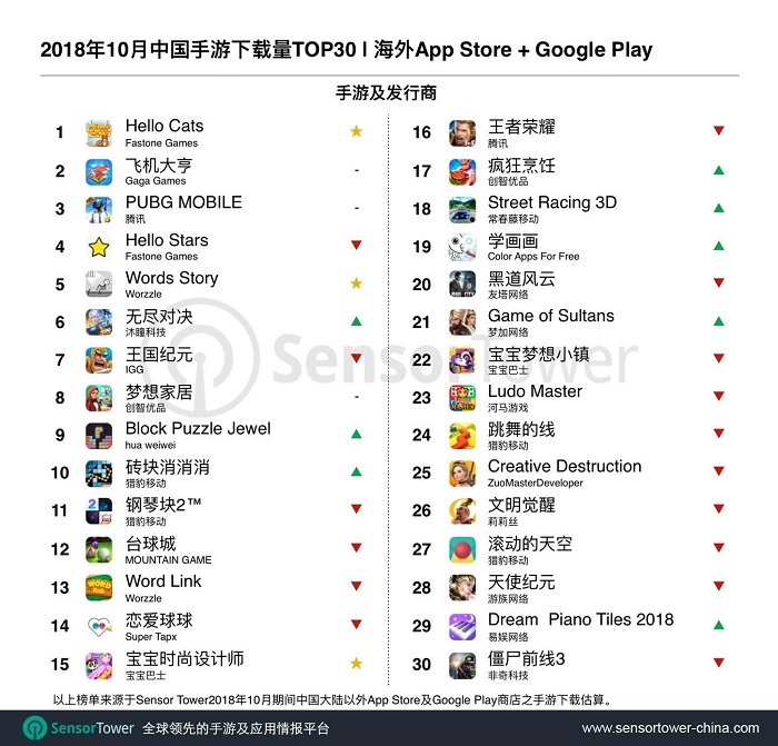 近日,Sensor Tower发布了2018年10月中国手游出海下载榜和收入榜。
