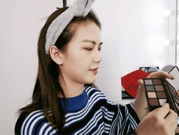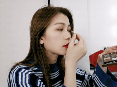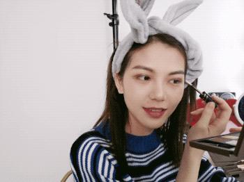 想要看起来温柔一些,可以在眼睛前半段用浅色珠光加一点,然后用相似色系的唇线笔来当作卧蚕,笑吟吟的也比较讨喜。