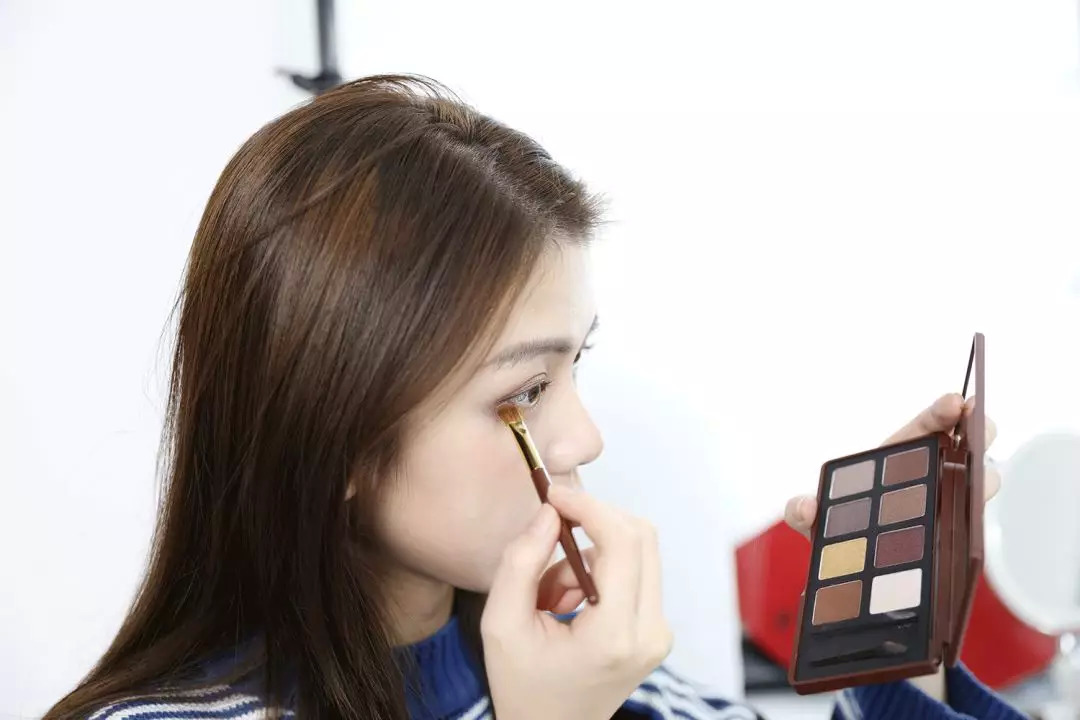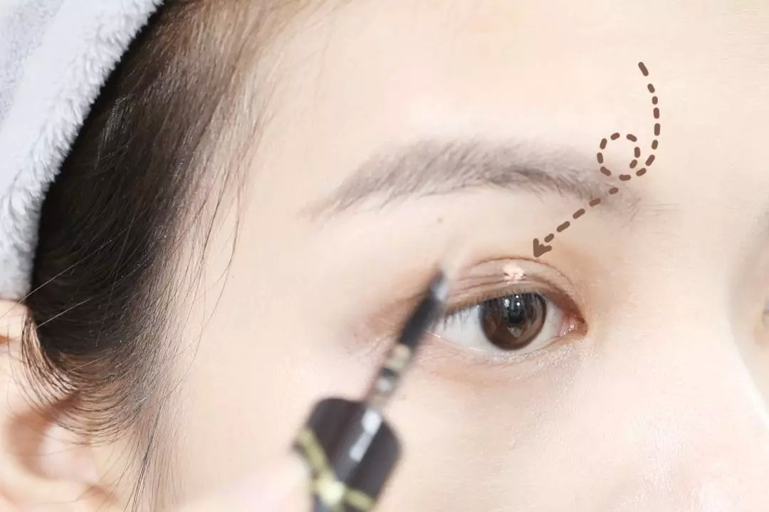 然后用浓郁一点的巧克力色打在双眼皮褶皱范围,这一步不要怕手抖,大胆上色,眼尾可以适当深一点,用晕染刷细细晕开边界就好。