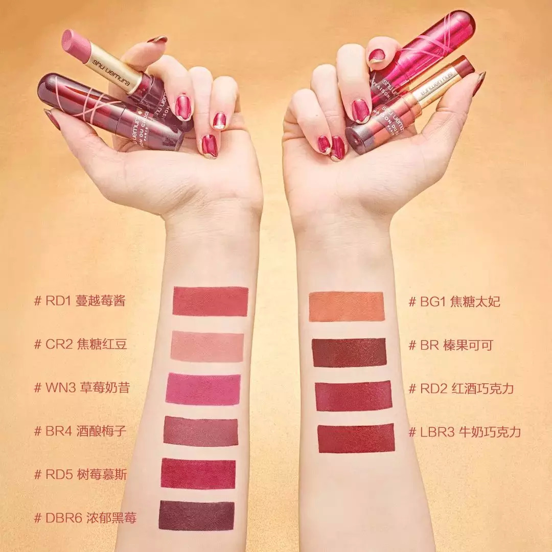 5号是树莓慕斯,想想一下甜品上面树莓酱的颜色就对啦,(植村秀把这系列吃的颜色做太准了),这个颜色很适合把嘴唇擦得厚厚的,性感又高级。