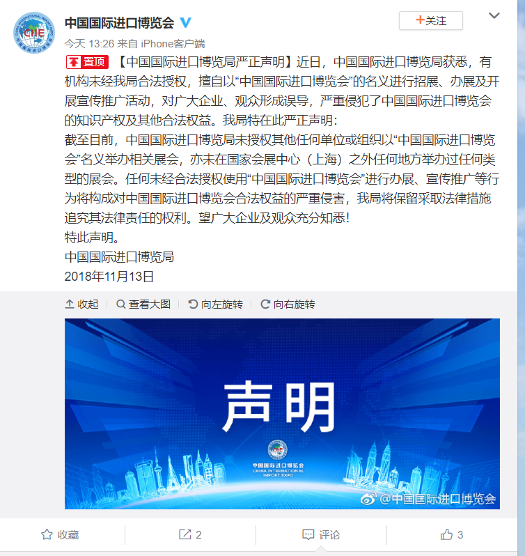 中国国际进口博览会官方微博消息,近日,中国国际进口博览局获悉,有机构未经我局合法授权,擅自以“中国国际进口博览会”的名义进行招展、办展及开展宣传推广活动,对广大企业、观众形成误导,严重侵犯了中国国际进口博览会的知识产权及其他合法权益。我局特在此严正声明: