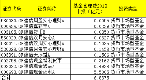 以今年公布的中报为例,上半年,建信基金公司收取的管理费收入高达10.41亿元,其中,货币基金的管理费就占到了6.84亿元,为公司整体收入立下了汗马功劳,也足见货币基金对其收入构成的重要性。