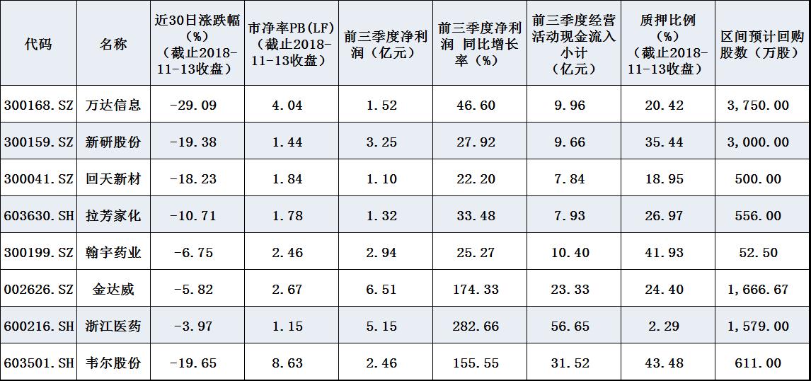 界面新闻整理了11月9日以来披露回购意愿的上市公司中,股价跌幅较大、市净率偏低、质押比例较低同时业绩面较好的部分标的,仅供投资者参考。